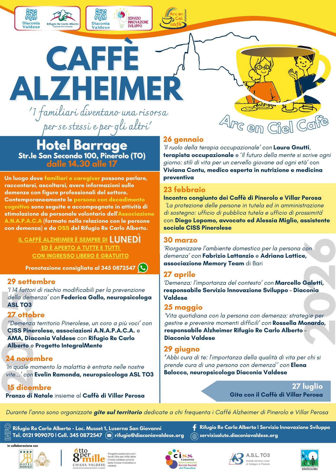 Il Caffè Alzheimer di Pinerolo è un progetto sostenuto con i fondi 8x1000 della Chiesa Valdese - Unione delle Chiese metodiste e valdesi che vede la partnership del C.I.S.S. Pinerolese, ASL TO3, Associazione ANAPACA di Pinerolo e la collaborazione dell’Hotel Barrage. L’ingresso è libero e gratuito ma è possibile prenotare tramite whatsapp scrivendo al numero 345 0872547.