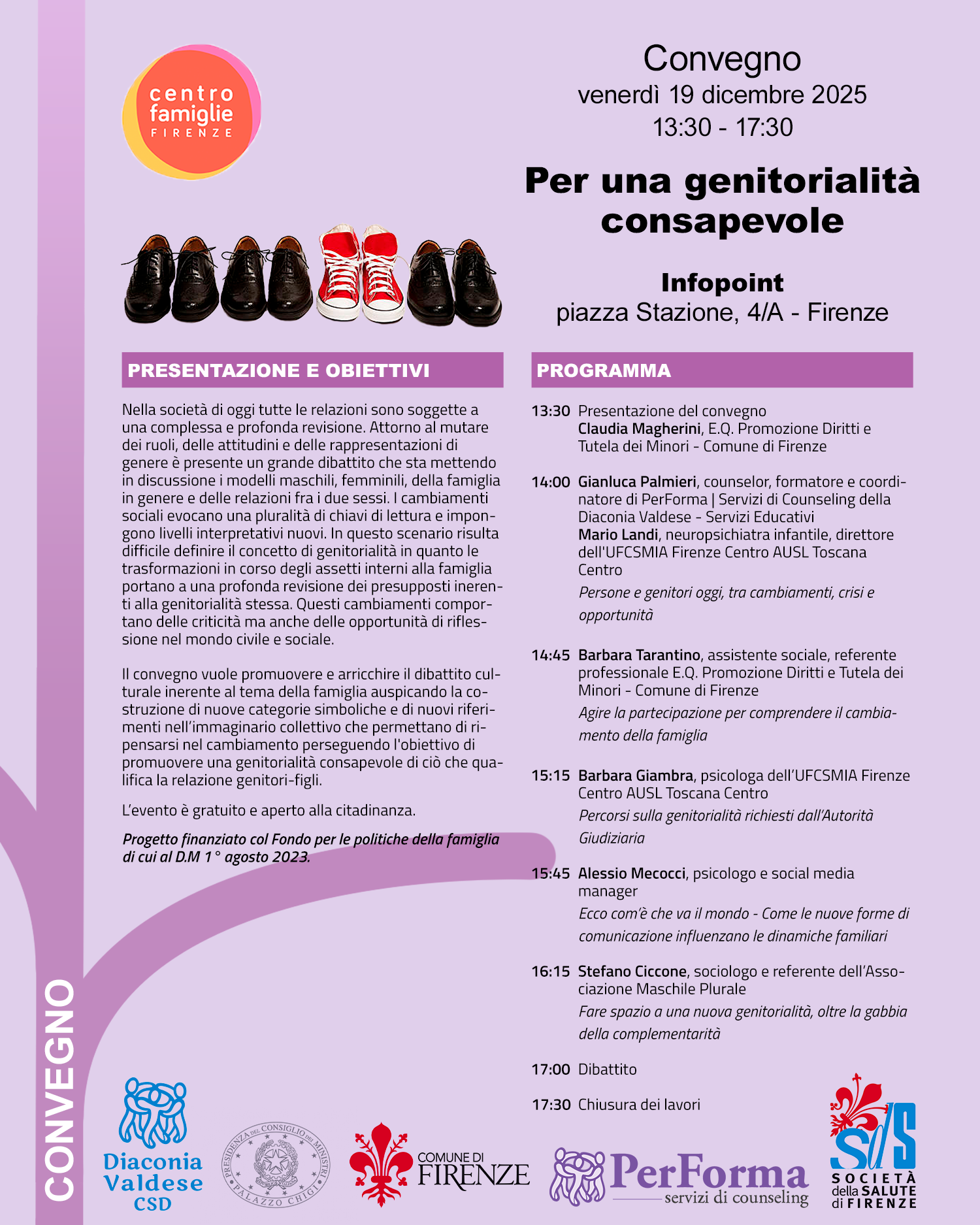 Venerdì 19 dicembre 2025 si terrà il secondo appuntamento con il convegno Per una genitorialità consapevole presso la sala conferenze dell’Infopoint, in piazza Stazione, 4/A a Firenze.