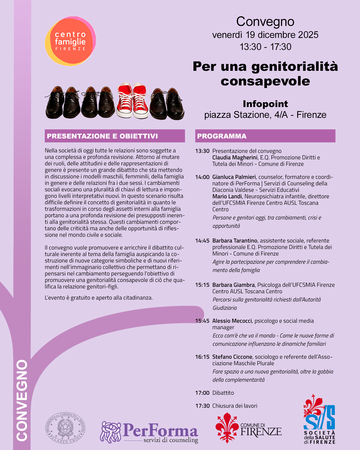 Venerdì 19 dicembre 2025 si terrà il secondo appuntamento con il convegno Per una genitorialità consapevole presso la sala conferenze dell’Infopoint, in piazza Stazione, 4/A a Firenze.