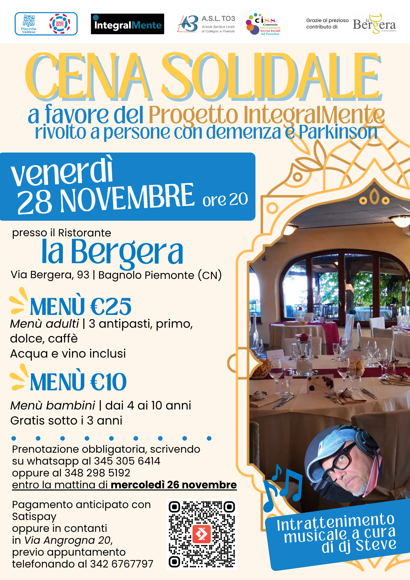 Venerdì 28 novembre, riflettori puntati sul progetto IntegralMente con la cena solidale (ore 20) organizzata presso il ristorante La Bergera di Bagnolo Piemonte (CN).